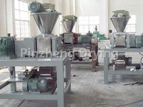 The forms of extrusion granulation can be divided into two types: roller-to-roll extrusion and roller-to-roll extrusion. The roller-to-roll extrusion is first pressed into large pieces, and then broken into particles. This device has large capacity, high particle strength, and low energy consumption. The roller-to-roll extrusion is widely used abroad. Wheel rolling is to directly make the roll surface into the shape of a cavity groove, and extrude it into a shaped particle at one time. When the strength of the product is low, it is sometimes necessary to add adhesive. It is suitable for making granular fertilizer such as organic fertilizer and compound fertilizer.